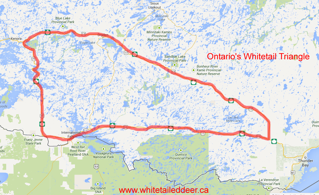 The original trails made by settlers back in the 1800s are now Highways 11, 71 and 17. These three highways form what's called the Whitetail Triangle. All along these roads is basically the only place you will find people and it's also where settlers hacked out the wilderness to make farmland. The soil is not good enough for special crops so farmers are forced to grow cattle feed crops such as corn and clover. All deer hunters know the deer go crazy over corn and clover and hunters also know that corn-fed and clover-fed Whitetails have the best tasting meat. Any lodges and outfitters that are close to the perimeter of the Whitetail Triangle will have the best Whitetail Deer Hunting in Ontario.