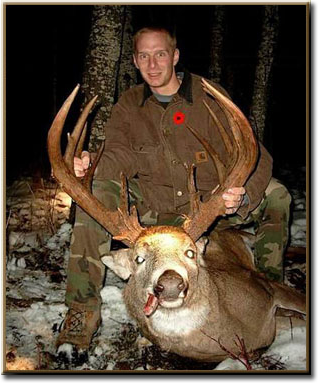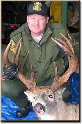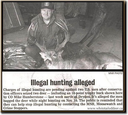 In Ontario, by law, all hunting rifles must be in their case at dark. The hunter that took this beautiful buck was chasing him for hours and decided to keep up the hunt. He took the deer 1/2 hour after the legal cut-off time for hunting and on private property. The worse thing is the poacher abandoned the deer to rot. Luckily MNR Agents were better hunters then the poachers and quickly closed in on them and made the arrest. Trial details and updates are available at the Ontario Conservation Officers Association web site.